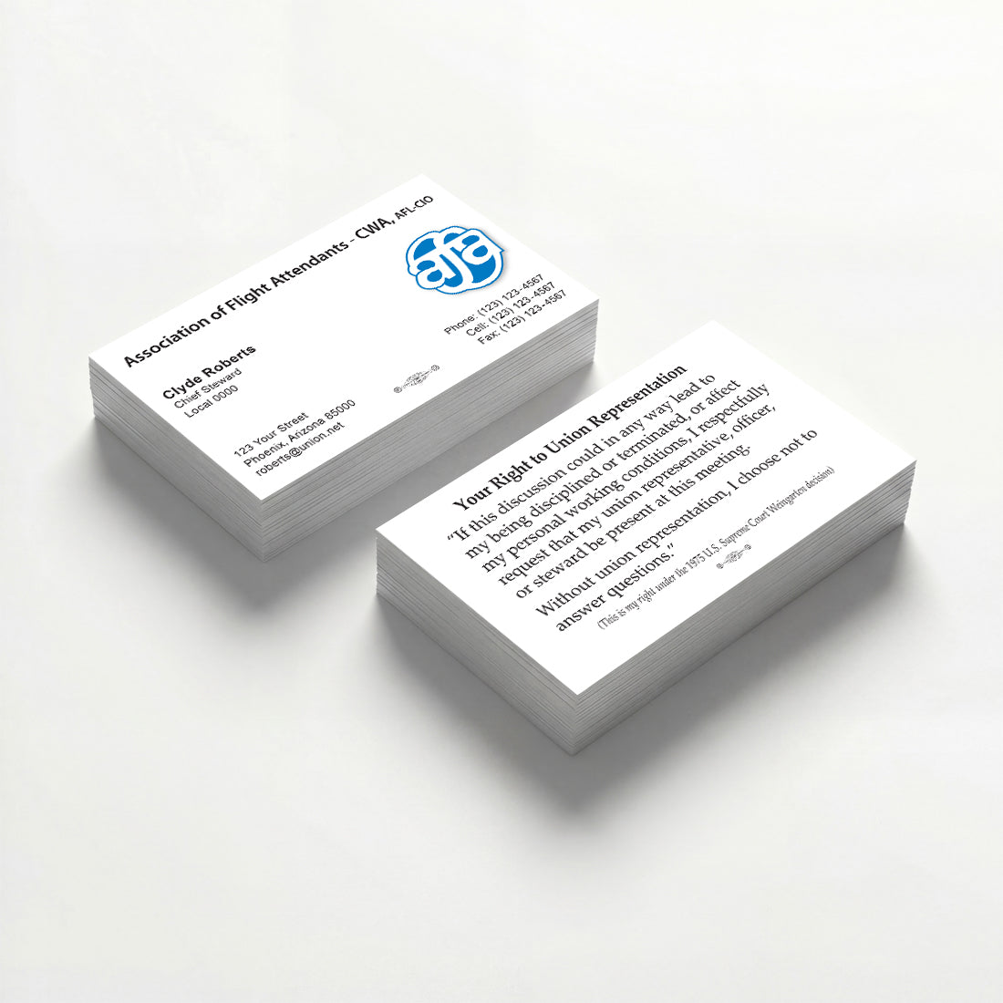 AFA custom union-printed business cards for locals, officers, organizers, and staff nationwide. All cards are union-made, printed in the USA, and produced to meet Association of Flight Attendants (AFA) standards.