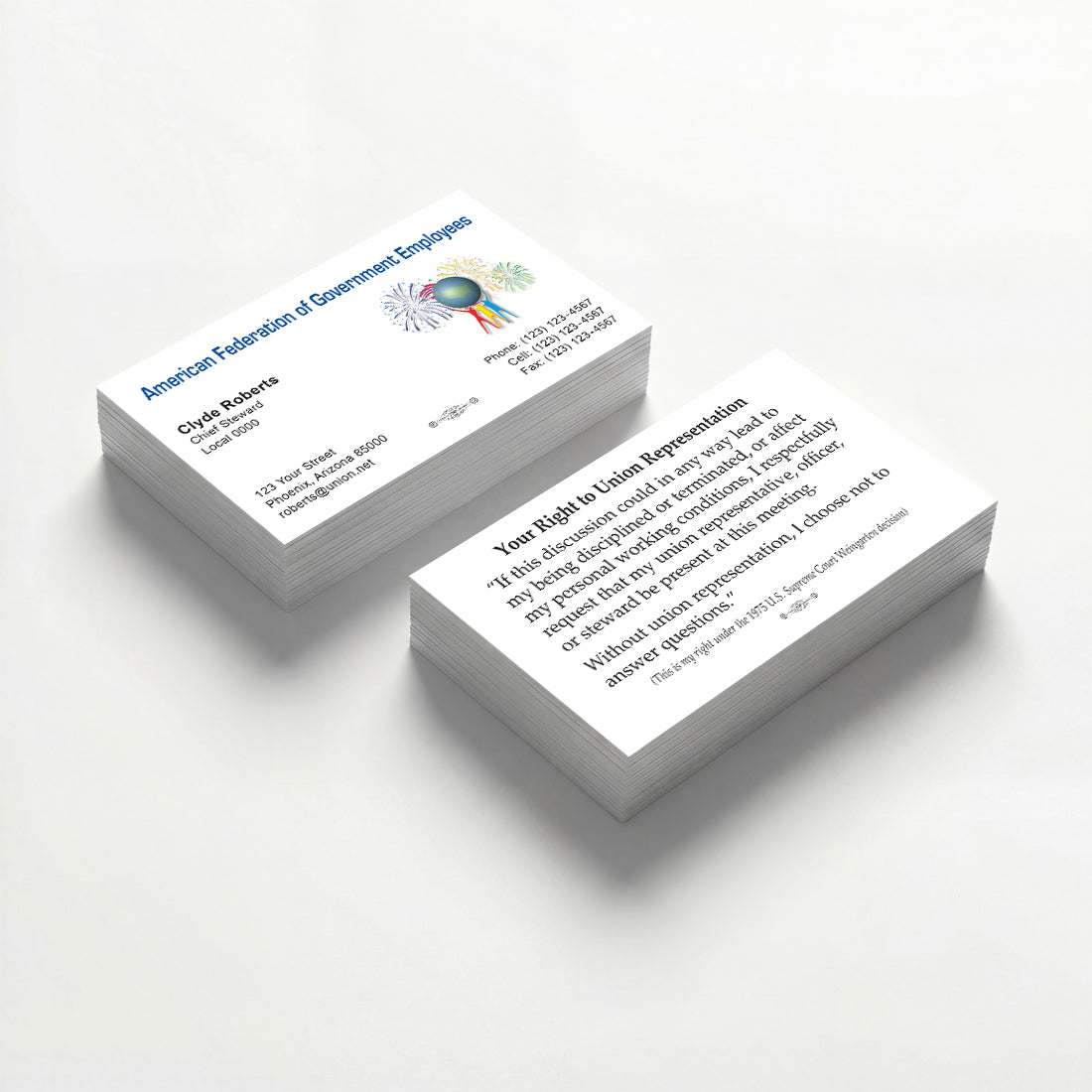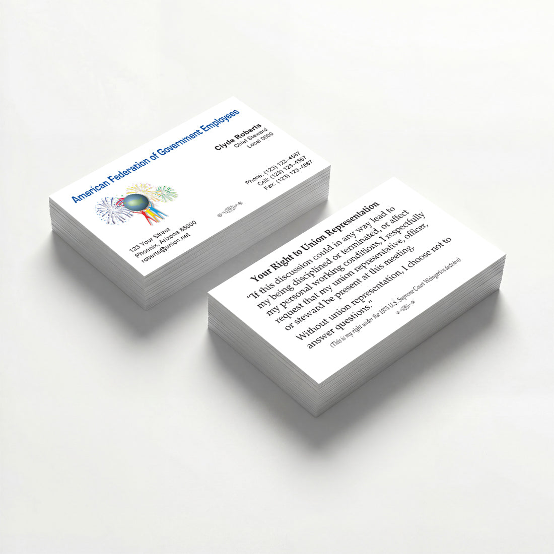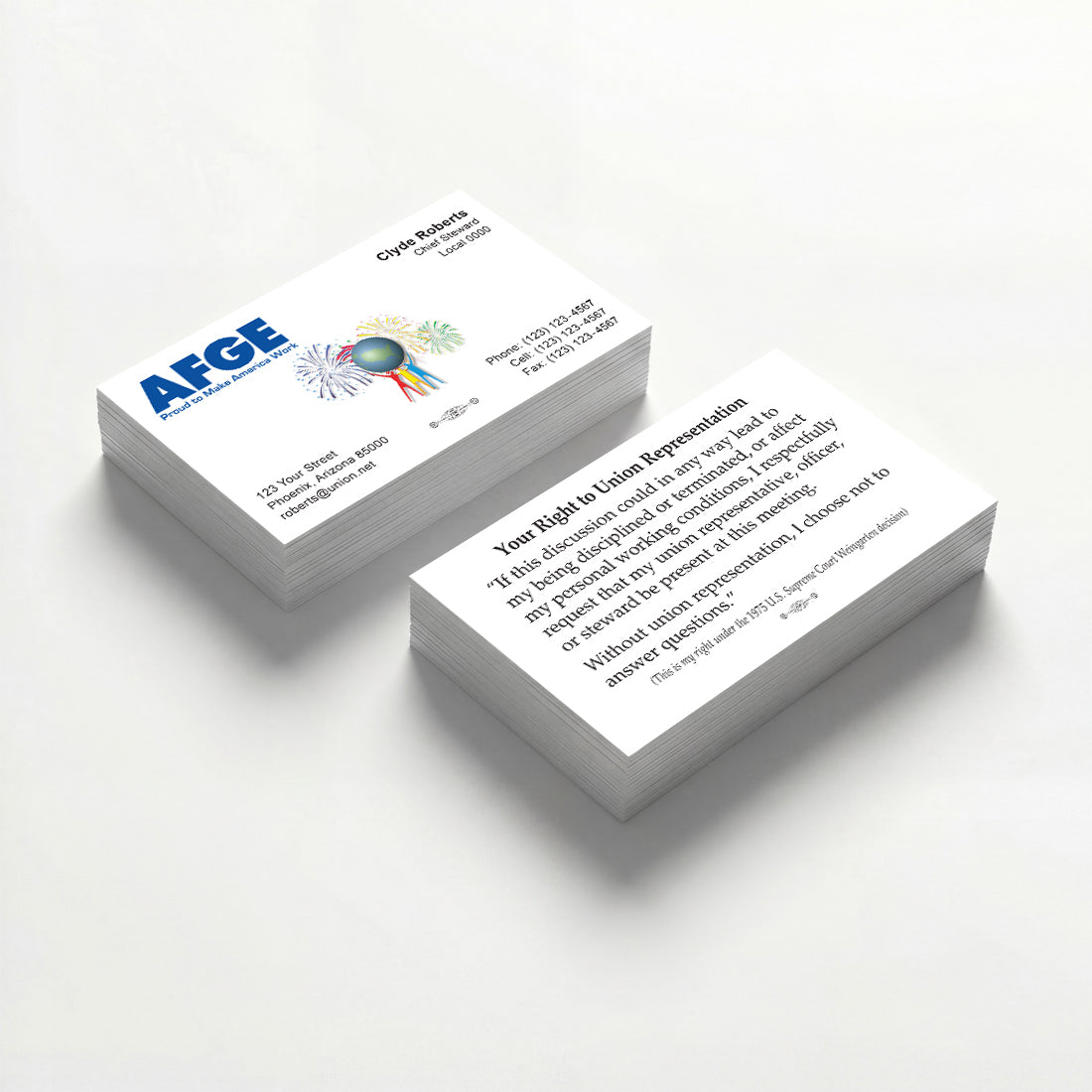 AFGE custom union-printed business cards for locals, officers, organizers, and staff nationwide. All cards are union-made, printed in the USA, and produced to meet American Federation of Government Employees (AFGE) standards.
